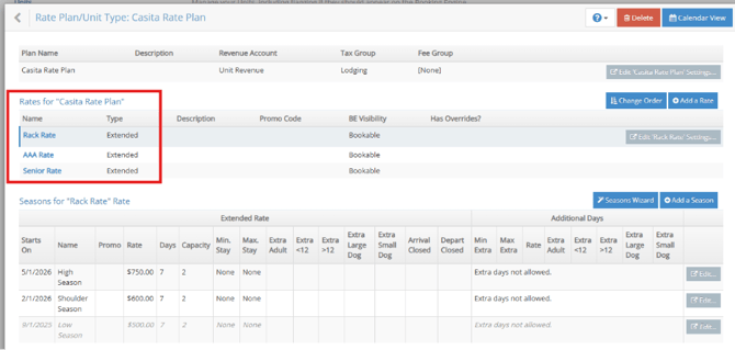 Configuration → Rate Plans / Unit Types → Rate Plan → Seasons |